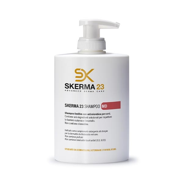 SKERMA 23 MD è una linea di prodotti specificatamente formulati e indicati come complemento detergente alla terapia per la dermatite da Malassezia nel cane.